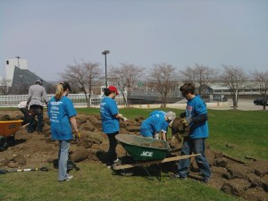 As part of Global Youth Service Day, Indians employees partnered with the Cuyahoga County Board of Developmental Disabilities and made their way to the corner of East 9th and Lakeside to put in an urban garden and a brick walkway right next to the giant Free Stamp.