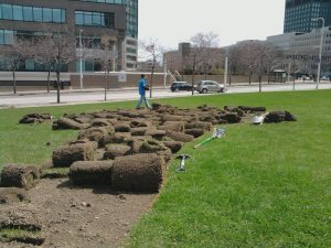 The 5 hours of volunteer work consisted of rolling up what seemed like a couple hundred rolls of sod and then moving them to pallets, planting apple trees, moving bricks so that they could be layed out into a walkway, raking dirt and top soil and everything else that goes along with putting in new landscape!