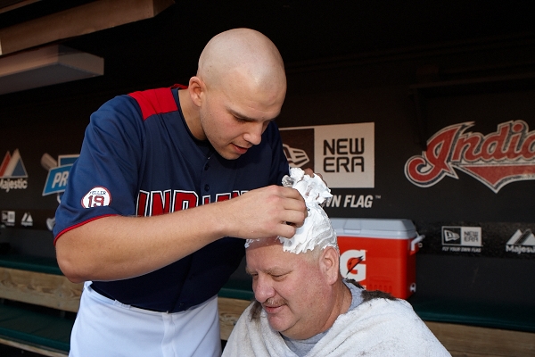The shaving took place in the Indians dugout prior to the team taking batting practice. Justin was ready with clippers, towels, shaving cream and a few razors. He took his time and enjoyed it making sure it was a nice, smooth shave. Although we were all waiting for it, no skin was cut during the shave. Justin cleaned off the freshly shaved scalp with water, put on some aftershave and stood back to smile at his work.