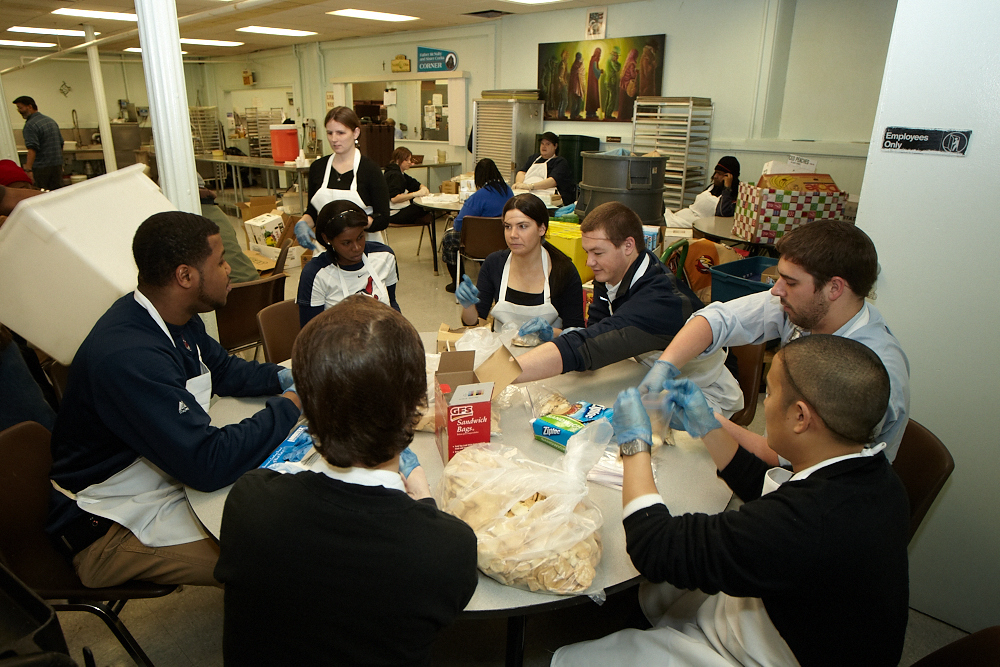 I’m here to share with you the Indians first Indians in the Community of 2012. Once again we kick started our year of volunteering at the St. Augustine Hunger Center in Cleveland. We had about 14 members of the Indians Front Office help prepare and serve lunch on January 11. We did anything from peeling potatoes, to cutting up peppers and onions, to re-stocking their food pantry. We then worked on the buffet line and served the customers their lunch. The meal was a pretty square meal including Italian sausage in cooked vegetables, mashed potatoes, salad, green beans, beef soup, bread, and a nice little piece of cake for dessert.